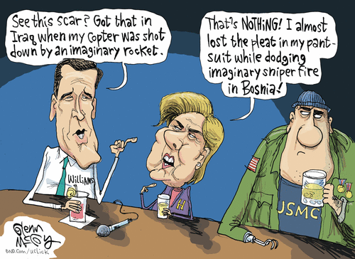 Both Williams and Hillary Clinton have gotten into trouble for telling battle stories which weren’t exactly accurate. In the stories they told they really were in the country they spoke about (Iraq/Bosnia), they really were flying around (Helicopter/plane), and there really was a threat to life (gunfire/rocket fire). They simply embellished or overgeneralized their stories. Normal people do it all the time. We say, “We’re all going to catch Ebola”, when only a few Americans actually catch Ebola. I said, “There were bullets flying everywhere, and people were being killed everywhere we went,” during the 1992 L.A. riots, but this isn’t extremely accurate. Yes, bullets were flying…in Los Angeles county, but just not right around myself. Yes, there were people being killed, but not right around me. It’s just how we talk. But when one is in a position of political authority or in a position in which people rely on them to speak accurately and truthfully, then these overgeneralization are unfounded and hazardous for both their listeners and for the speaker.