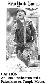 For example, on September 30, 2000 the New York Times printed a picture of an angry-looking Israeli police officer and a bloodied young man. The Times caption read, “An Israeli policeman and a Palestinian on the Temple Mount.” Any reasonable reader could conclude that the Palestinian had been beaten about the head by the police officer until he was soaked in his own blood. Israelis were outraged that media in the West would continue to depict the Israelis as brutal thugs attacking the innocent Palestinian.